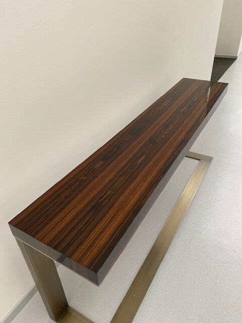 Charlotte ist eine raffiniert geestaltete Konsole auf symmetrischem Gestell mit asiatischer Anmutung. Dank des symmetrischen Gestells kann sie ideal frei im Raum oder als optischer Raumteiler platziert werden. Platte in verschiedenen Lackfarben der in exklusiven Holzfurnieren, das gekreuzte Metallgestell in verschiedenen Oberflächenveredelungen erhältlich. Ihre auffällig, skulpturale Form macht CHARLOTTE zum Highlight in jedem Ambiente.